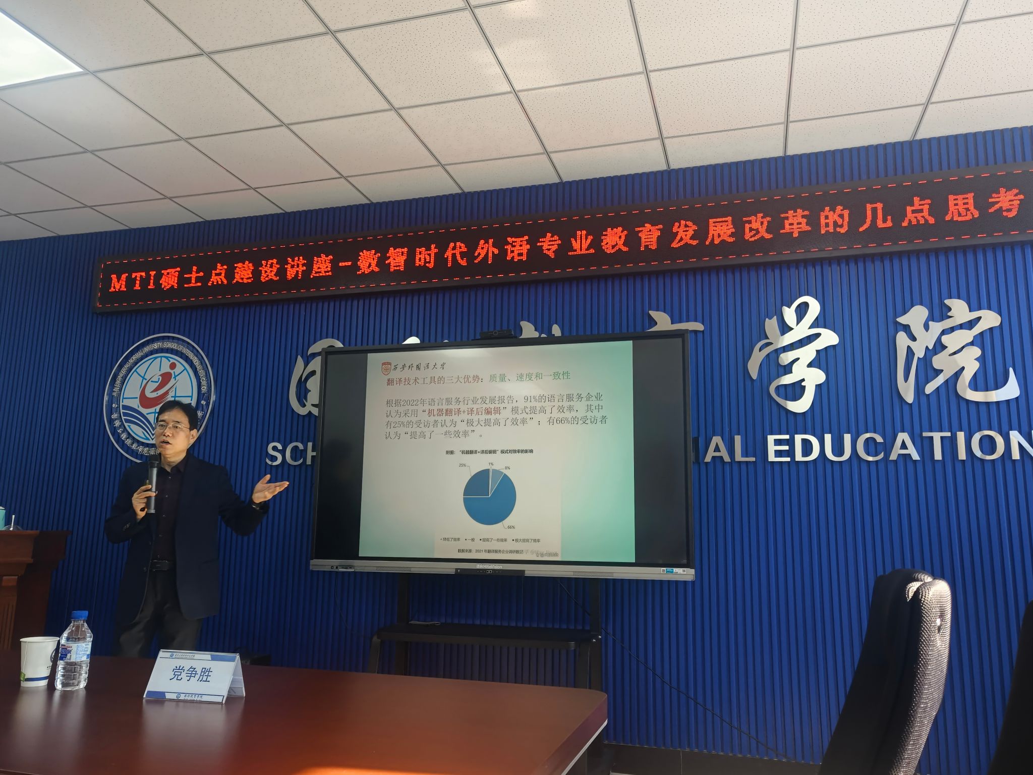 讲座由威廉希尔足球官网院长李娟教授主持。党争胜教授以"数智时代外语专业教育发展改革的战略思考"为题,深入剖析了新时代背景下外语教育的转型路径。他从英语专业创新发展与翻译专业建设两大维度,系统阐释了数智时代外语教育的改革方向。党校长特别强调,外语专业建设要牢牢把握"外"字特色,突出"变"字创新,强化"用"字实效,着力培养具有国际视野的高层次应用型人才。在翻译专业建设方面,他提出要重点打造"高层次、应用型、职业化"三位一体的人才培养体系,为讲好中国故事、传播中国声音提供人才支撑。